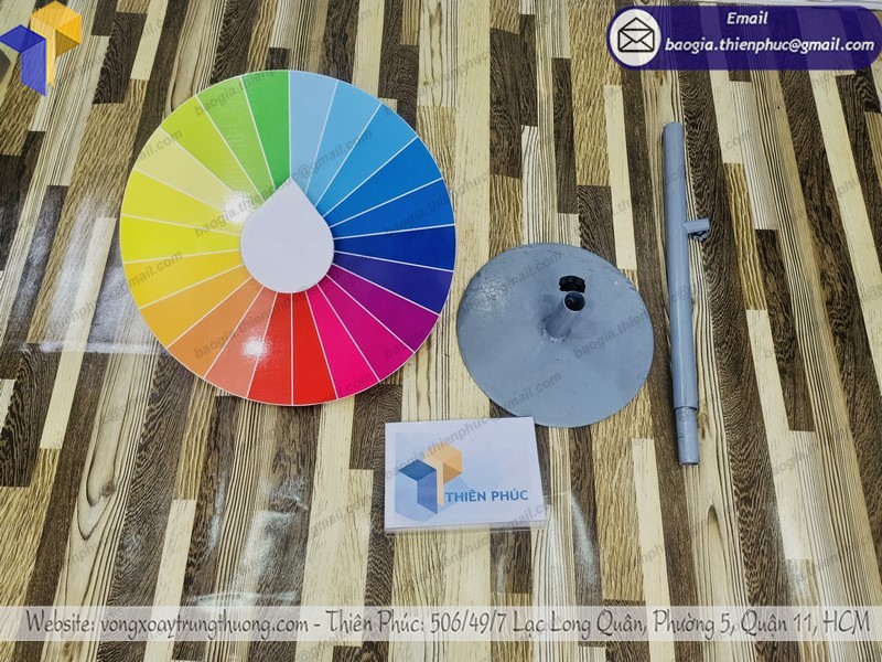 Màu sắc của vòng quay trúng thưởng đế bàn khá đa dạng, trên mặt vòng quay được khách hàng dán nội dung theo yêu cầu, tùy thuộc vào nội dung của quý khách.