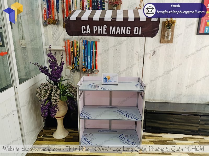 - Thiết kế xe bán café rang xay thông minh trang bị đầy đủ các vật dụng, kết cấu xe khoa học giống như một gian hàng nhỏ, giúp bạn bán hàng mọi lúc mọi nơi