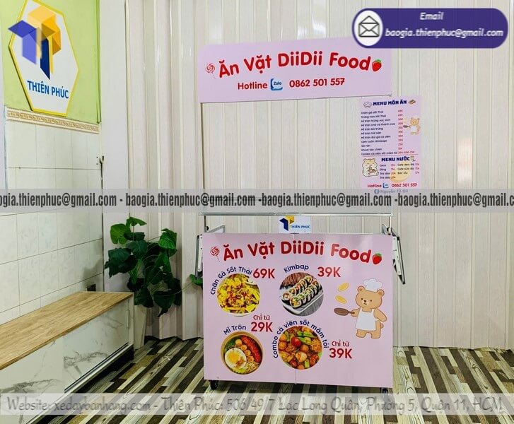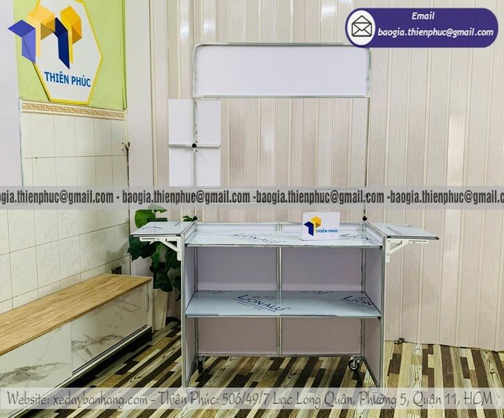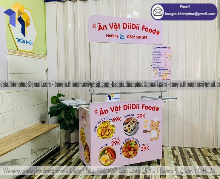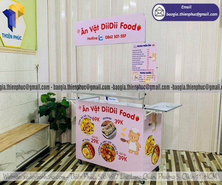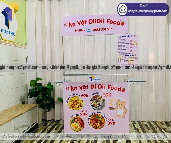 Bán quầy ăn vặt hàng rong gấp xếp đẩy di động giá sỉ - Xưởng sản xuất & Công Ty Thiên Phúc là xưởng chuyên nhận đặt làm theo yêu cầu, gia công, sản xuất, thiết kế & in ấn logo thương hiệu - nhãn hiệu - menu sản phẩm quầy bán dạo gấp gọn lưu động theo yêu cầu khách hàng với hơn 10 năm kinh nghiệm, cung cấp nhiều mẫu kệ/tủ/quầy/xe bán hàng gấp gọn lưu động, chỉ cần 700.000đ/quầy trở lên với chất lượng ốp bạt đến trên 2.200.000đ/quầy trở lên sẽ có đầy đủ kệ ly, bệ xếp,... chưa kèm theo chi phí khác như menu, ô dù,... Hỗ trợ xuất hóa đơn VAT. Đặt hàng từ 10 quầy trở lên được chiết khấu cực kỳ ưu đãi. Giao hàng nhanh trên toàn quốc. Thiết kế logo hoàn toàn miễn phí.