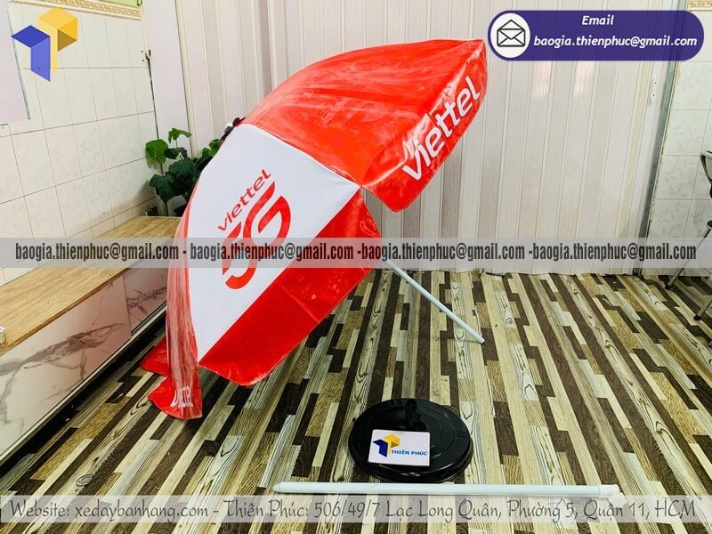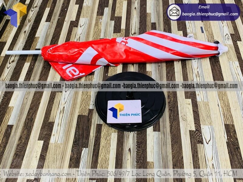 Báo giá dù tròn in bạt quảng cáo dựng ngoài trời rẻ - Xưởng sản xuất & Công Ty Thiên Phúc chuyên cung cấp nhiều mẫu ô/dù quảng cáo tròn lớn che ngoài trời & thiết kế, in ấn logo thương hiệu với kích thước chủ yếu 2.2m đến 2.4m, 2.7m hoặc lớn hơn 3m.Với giá dao động rẻ nhất, cạnh tranh nhất thị trường chỉ riêng cây ô dù: 600.000đ - 800.000đ/cây; đế dù mua lẻ: 150.000đ/cái. Nếu mua đế cùng cây dù giảm còn 100.000đ/cái. Đặt số lượng lớn nhận ngay nhiều chiết khấu ưu đãi. Hỗ trợ xuất hóa đơn VAT đỏ cho doanh nghiệp & công ty. Liên hệ ngay xưởng Thiên Phúc nhận ngay báo giá nhanh chóng và tư vấn thiết kế logo. Giao hàng nhanh trên toàn quốc trong vòng 3-5 ngày tùy thuộc vào số lượng.
