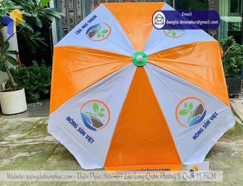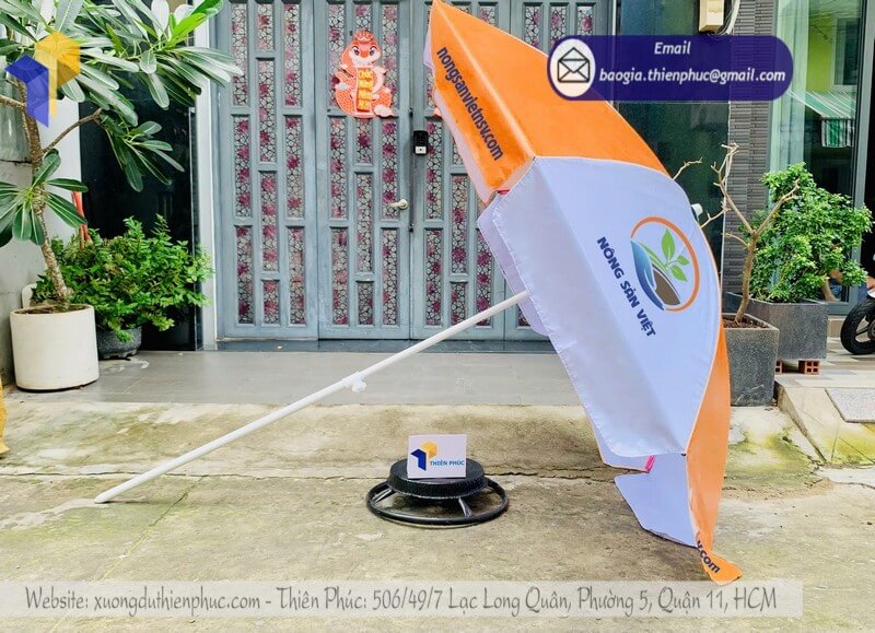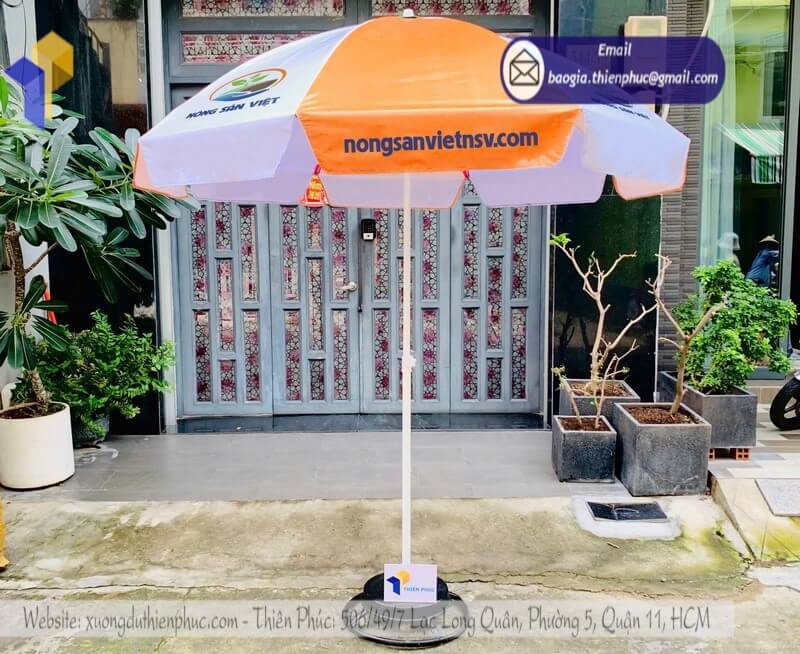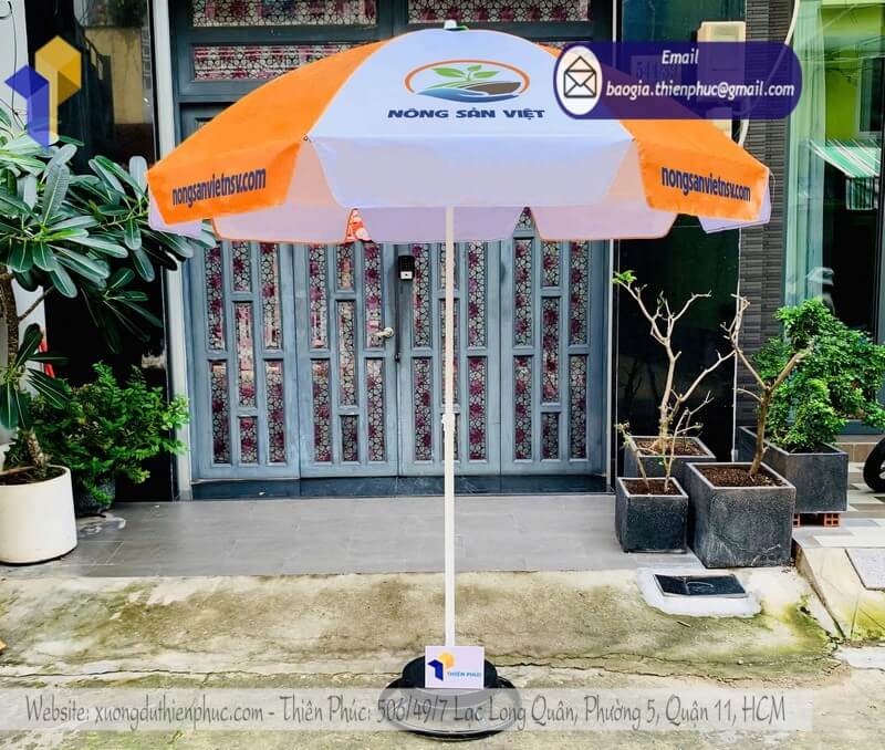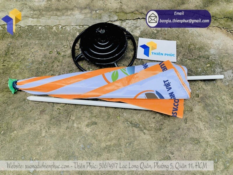 Báo giá dù tròn quảng cáo che ngoài trời in bạt rẻ - Xưởng sản xuất & Công Ty Thiên Phúc chuyên cung cấp nhiều mẫu ô/dù quảng cáo tròn lớn che ngoài trời & thiết kế - in ấn logo với kích thước chủ yếu 2.2m đến 2.4m, 2.7m hoặc lớn hơn 3m.Với giá dao động rẻ nhất, cạnh tranh nhất thị trường chỉ riêng cây ô dù: 600.000đ - 800.000đ/cây; đế dù mua lẻ: 150.000đ/cái. Nếu mua đế cùng cây dù giảm còn 100.000đ/cái. Đặt số lượng lớn nhận ngay nhiều chiết khấu ưu đãi. Hỗ trợ xuất hóa đơn VAT đỏ cho doanh nghiệp & công ty. Liên hệ ngay xưởng Thiên Phúc nhận ngay báo giá nhanh chóng và tư vấn thiết kế logo. Giao hàng nhanh trên toàn quốc trong vòng 2-3 ngày.