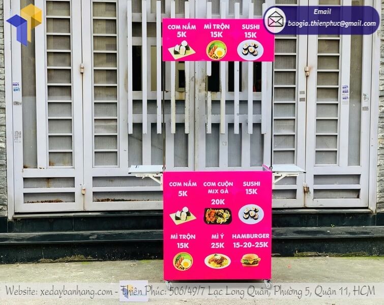 Kích Thước: W100 x H190cm Quy Cách Kỹ Thuật: + Phần mái che: Ngang 110 cm x Cao 30cm + Phần xe : Ngang 100cm x Hông 50cm x Cao 80cm + Bánh xe chịu lực 80kg + Bốn thanh chống inox vuông 12mm giữa xe và mái che cao 1m + Hình ảnh : In decan ngoài trời máy Nhật sắc nét 1400 DPI + Xung quanh xe ốp fomat dày 5mm + Mặt trên xe và vách ngăn bên trong khung sắt ốp ALU + Khung xương sắt vuông 14mm mạ kẽm chống rỉ sét + Toàn bộ có thể tháo lắp, gấp gọn dễ di chuyển