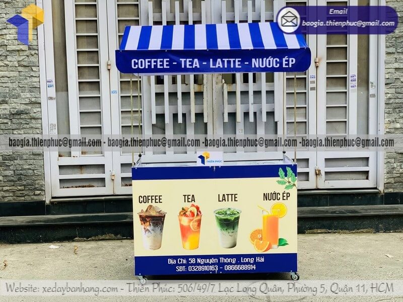 Thiết kế gọn nhẹ, dễ di chuyển, có mái che chống nắng mưa, bố trí mặt bàn hợp lý để đặt máy pha cà phê, máy xay, bình nước, phù hợp bán tại vỉa hè, khu văn phòng, trường học, khu công nghiệp.