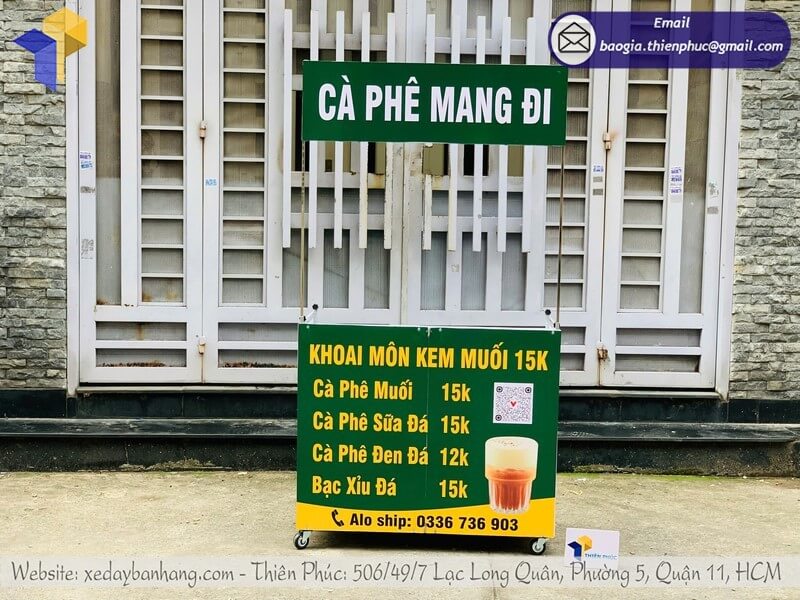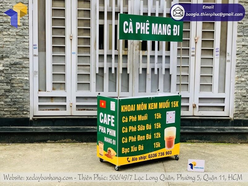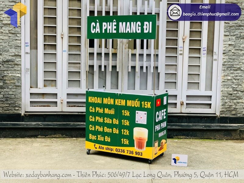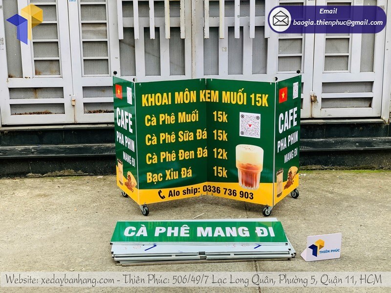 Báo giá quầy bán cafe dạo xếp gọn di động ngoài trời - Xưởng Thiên Phúc chuyên nhận sản xuất và gia công quầy bán cafe với giá rẻ chuẩn xưởng, không qua trung gian. Giá rẻ dao động chỉ từ 700.000đ/quầy đối với loại quầy ốp bạt, chưa bao gồm các phụ kiện đi kèm khác như bệ xếp, ngăn quầy, ô dù che xe hoặc đèn led,.. Thiết kế logo thương hiệu, nhãn hiệu hoặc menu theo yêu cầu khách hàng, hoàn toàn miễn phí. Hãy liên hệ trực tiếp với chúng tôi để được báo giá và nhận ngay mẫu quầy đẹp.