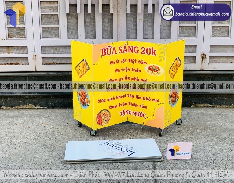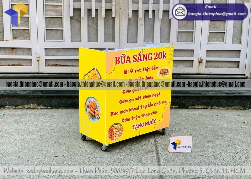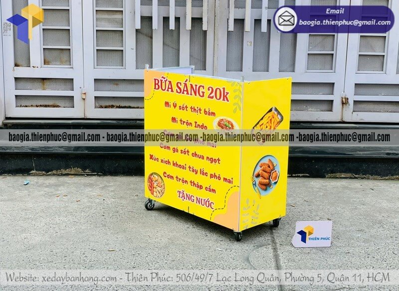 Báo giá quầy bán đồ ăn bán dạo lưu động trên vỉa hè - Xưởng sản xuất & Công Ty Thiên Phúc là xưởng chuyên nhận gia công - sản xuất - thiết kế & in ấn logo thương hiệu - nhãn hiệu - menu sản phẩm tủ bán hàng rong lắp ráp lưu động theo yêu cầu khách hàng với hơn 10 năm kinh nghiệm, cung cấp nhiều mẫu tủ/quầy/xe bán hàng gấp gọn lưu động, chỉ cần 700.000đ/xe trở lên với chất lượng ốp bạt,... chưa kèm theo chi phí khác như menu, đèn led, ô dù, kệ xếp,... Hỗ trợ xuất hóa đơn VAT. Đặt hàng từ 10 tủ trở trở lên giảm mỗi kệ 50.000đ. Giao hàng nhanh trên toàn quốc. Thiết kế logo hoàn toàn miễn phí.
