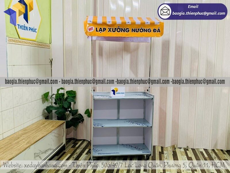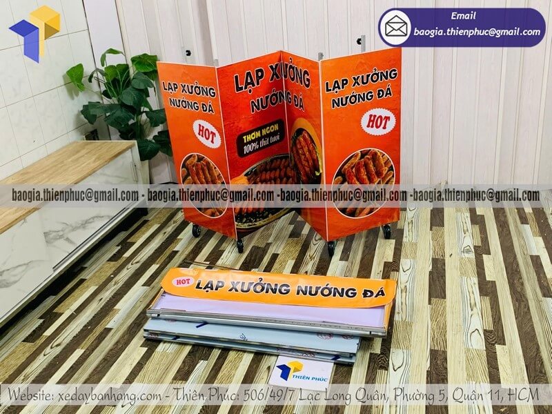 Báo giá quầy bán lạp xưởng nướng đá hè phố lắp ráp rẻ - Xưởng sản xuất & Công Ty Thiên Phúc là xưởng chuyên nhận đặt làm theo yêu cầu, gia công, sản xuất, thiết kế & in ấn logo thương hiệu, nhãn hiệu, menu sản phẩm quầy bán dạo gấp gọn lưu động theo yêu cầu khách hàng với hơn 10 năm kinh nghiệm, cung cấp nhiều mẫu kệ/tủ/quầy/xe bán hàng gấp gọn di động, chỉ cần 700.000đ/quầy trở lên với chất lượng ốp bạt đến trên 2.200.000đ/quầy trở lên sẽ có đầy đủ kệ ly, bệ xếp,... chưa kèm theo chi phí khác như bảng menu, ô dù che, kệ ly, bệ xếp phụ... Hỗ trợ xuất hóa đơn VAT. Đặt hàng từ 10 kệ trở lên được chiết khấu cực kỳ ưu đãi. Giao hàng nhanh trên toàn quốc trong vòng 2-3 ngày hoặc khách đến ngay tại xưởng lấy hàng. Thiết kế logo hoàn toàn miễn phí. Tặng kèm thêm 1 hashtag cầm tay.
