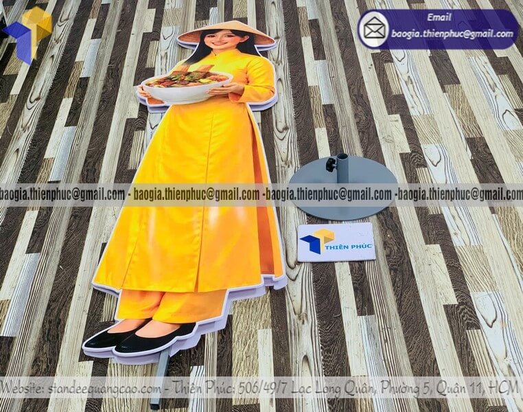 Standee mô hình người in hai mặt quảng cáo là dạng bảng quảng cáo được thiết kế theo hình dáng người thật hoặc nhân vật minh họa, in nội dung quảng cáo ở cả hai mặt giúp tăng khả năng tiếp cận khách hàng từ nhiều hướng.