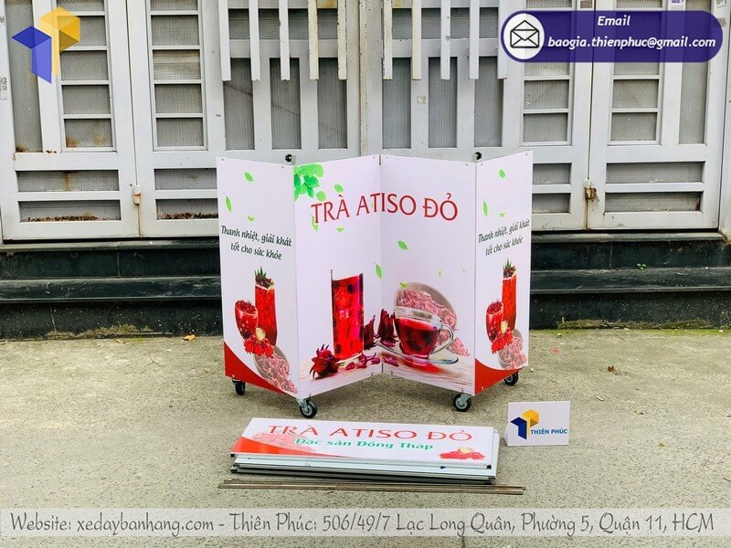 Kích Thước: W100 x H190cmQuy Cách Kỹ Thuật:+ Phần mái che: Ngang 110 cm x Cao 30cm+ Phần xe : Ngang 100cm x Hông 50cm x Cao 80cm+ Bánh xe chịu lực 80kg+ Bốn thanh chống inox vuông 12mm giữa xe và mái che cao 1m+ Hình ảnh : In decan ngoài trời máy Nhật sắc nét 1400 DPI+ Xung quanh xe ốp fomat dày 5mm+ Mặt trên xe và vách ngăn bên trong khung sắt ốp ALU+ Khung xương sắt vuông 14mm mạ kẽm chống rỉ sét+ Toàn bộ có thể tháo lắp, gấp gọn dễ di chuyển