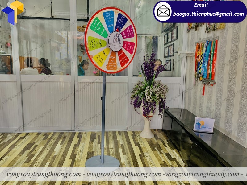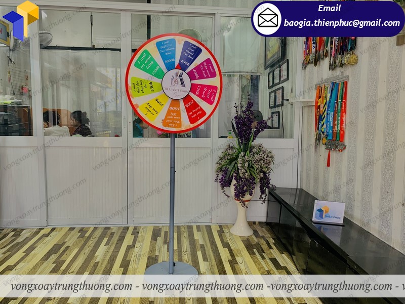 Vòng quay trúng quà mỗi ngày hay còn gọi là vòng quay trúng thưởng là một sản phẩm thường dùng trong những cửa hàng khai trương, giảm giá sản phẩm, những gian hàng hội chợ, gian hàng triển lãm muốn thu hút được nhiều khách thì không thể thiếu việc trang bị thêm một vòng quay may mắn nhằm gây chú ý đến mọi người xung quanh. Với kết cấu vững chắc nhưng rất cơ động, vòng quay may mắn trúng thưởng có thể tháo rời, gấp gọn để mang đi tiện lợi.