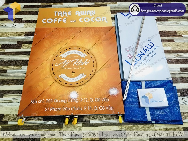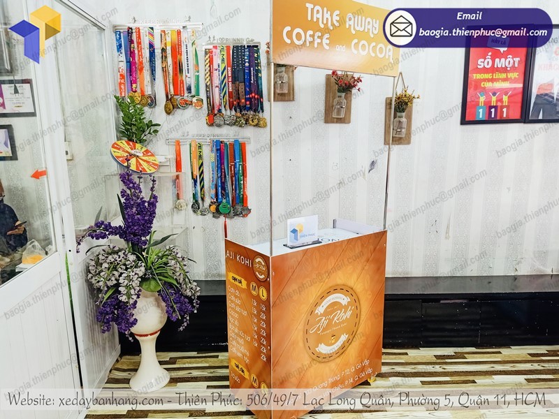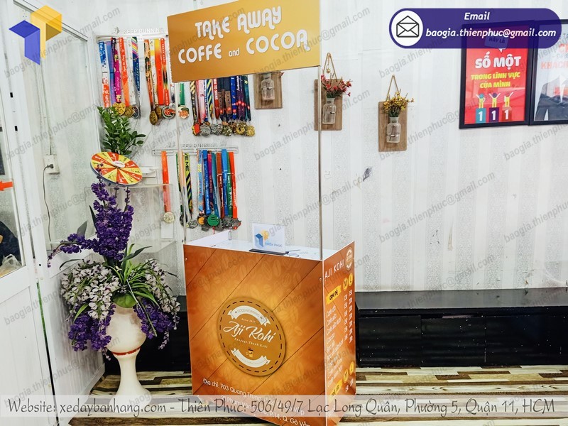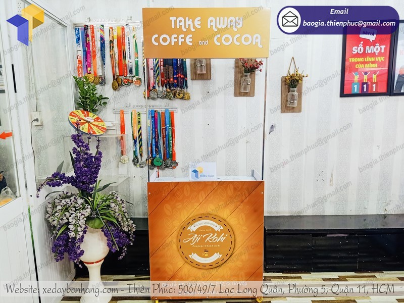 - Decal xe: xe gấp gọn take away vỉa hè của bạn có hấp dẫn có lôi cuốn khách hàng hay không là nhờ được trang trí đẹp, trên xe bạn có thể đặt logo thương hiệu, menu cà phê, số điện thoại của bạn để khách hàng có thể gọi đi giao.