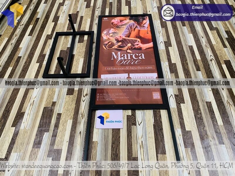 Biển hiệu khung sắt 2 mặt dựng di động ngoài trời - Xưởng sản xuất & Công Ty Thiên Phúc chuyên nhận gia công - cung cấp - sản xuất - thiết kế và in ấn logo thương hiệu, nhãn hiệu, menu sản phẩm. Nhiều mẫu bảng standee đứng 2 mặt quảng cáo bằng khung sắt với giá rẻ cạnh tranh nhất thị trường, không qua trung gian dao động chỉ với trên 800.000đ/cái đến 1.500.000đ/cái trở lên. Riêng thêm phần tay cầm: 50.000đ/cái. Hỗ trợ thiết kế logo thương hiệu theo yêu cầu. Đặt hàng số lượng lớn từ 10 cái trở lên được chiết khấu ưu đãi với giá sỉ. Nhận làm hàng nhanh giao gấp trong vòng 1-2 ngày. Khách hàng có thể đến lấy hàng trực tiếp tại xưởng/văn phòng. Hãy liên hệ ngay xưởng sản xuất Thiên Phúc để nhận được thông tin báo giá chi tiết nhất và đặt hàng nhanh chóng ngay hôm nay.