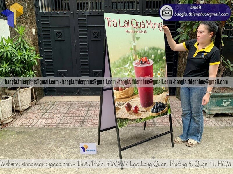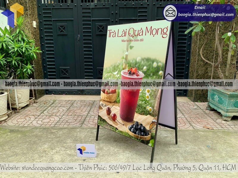 Biển quảng cáo chữ A chân sắt ngoài trời giá rẻ - Xưởng sản xuất & Công Ty Thiên Phúc chuyên nhận thiết kế và in ấn logo thương hiệu theo yêu cầu khách hàng. Chuyên nhận đặt làm nhiều kích thước - cung cấp - sản xuất - gia công nhiều mẫu bảng standee quảng cáo in 1 mặt/2 mặt đặt trước cửa hàng, bán trên vỉa hè. Tại xưởng, giá standee chữ A chân sắt in logo 2 mặt quảng cáo dao động chỉ từ 500.000đ/cái - trên 1.000.000đ/cái trở lên. Tùy thuộc vào kích thước và số lượng đặt hàng. Hỗ trợ xuất hóa đơn VAT nhanh chóng cho doanh nghiệp. Liên hệ ngay với chúng tôi - xưởng sản xuất Thiên Phúc để nhận được báo giá và đặt hàng nhanh chóng ngay hôm nay. Giao hàng nhanh trên toàn quốc. Đặt từ 10 cái trở lên sẽ nhận được chiết khấu ưu đãi nhất với giá sỉ.