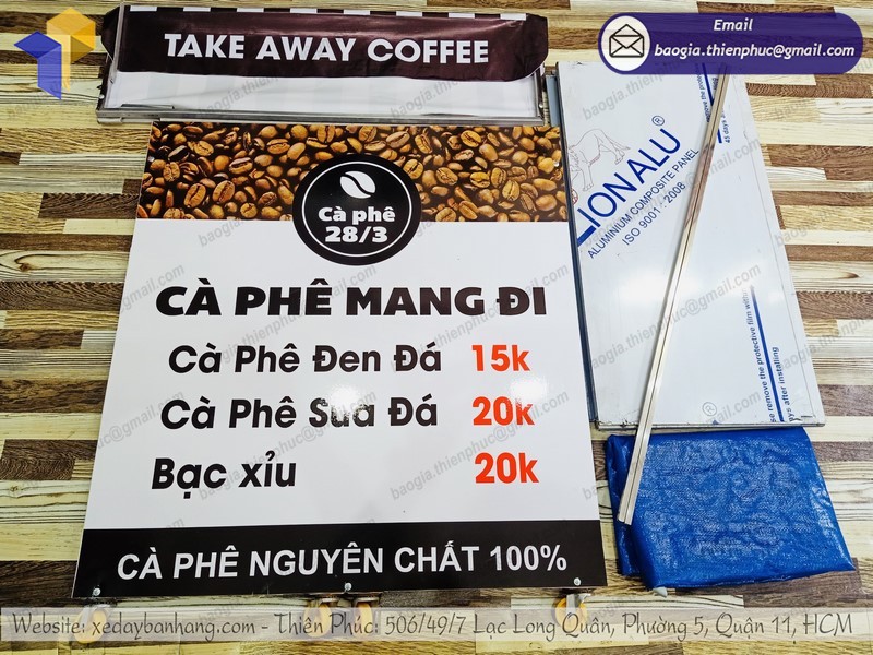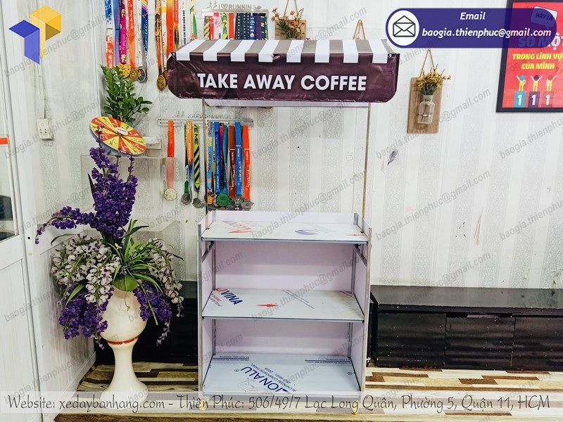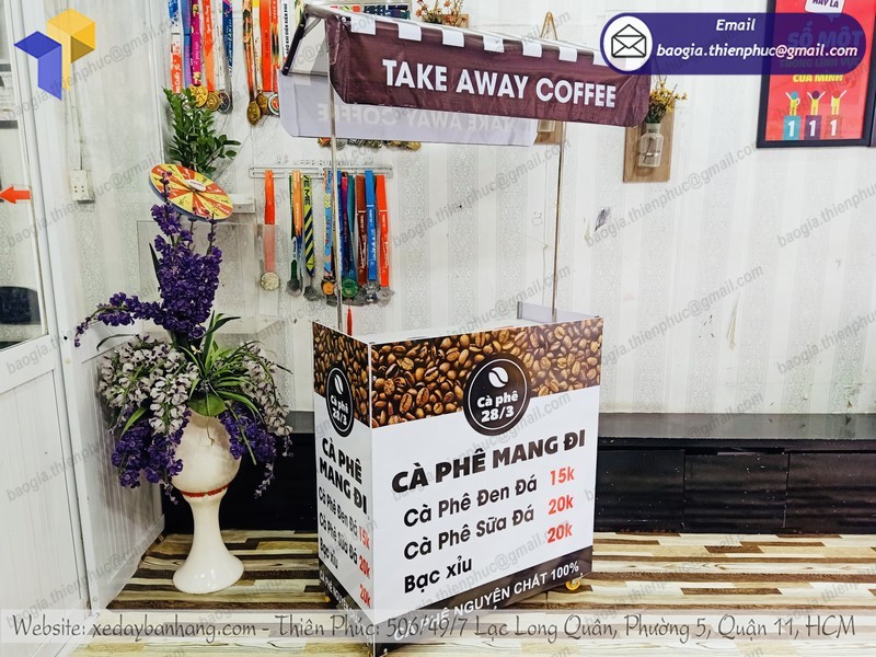 Làm xe cafe bán take away gấp gọn từ Thiên Phúc quý khách hàng sẽ hài lòng về sản phẩm như: thiết kế đẹp mắt, khác biệt và độc đáo, dễ dàng lắp đặt và tháo gỡ, dễ di chuyển trong quá trình quảng cáo và trưng bày, vật liệu bền chắc đảm bảo tính năng sử dụng…