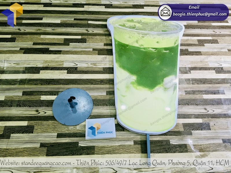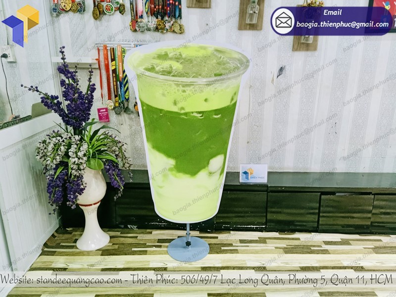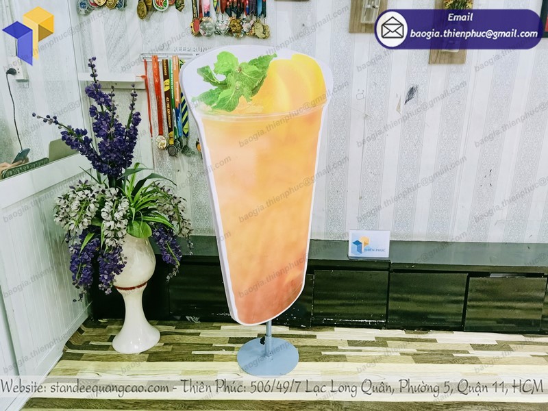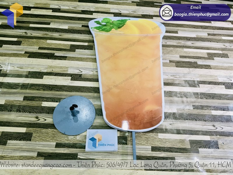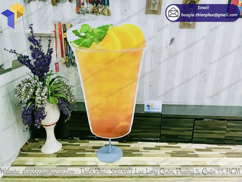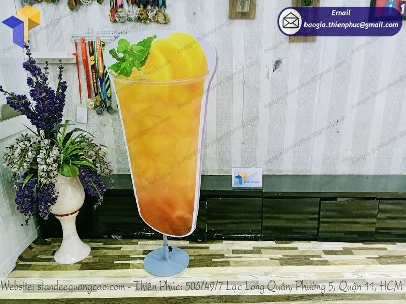 Hôm nay Thiên Phúc sẽ giới thiệu đến bạn dòng sản phẩm standee mô hình ly trà đào. Standee mô hình sản phẩm sử dụng rộng rãi trong các chiến dịch truyền thông. Chúng được tạo ra dưới sự mô phỏng của sản phẩm nhằm đem lại ấn tượng trong mắt khách hàng. Hình ảnh sản phẩm được dựng standee tạo sự chào mời tới người tiêu dùng bởi độ thật của chúng. Standee mô hình sản phẩm thích hợp sử dụng khi cửa hàng có sản phẩm mới, event quảng cáo.