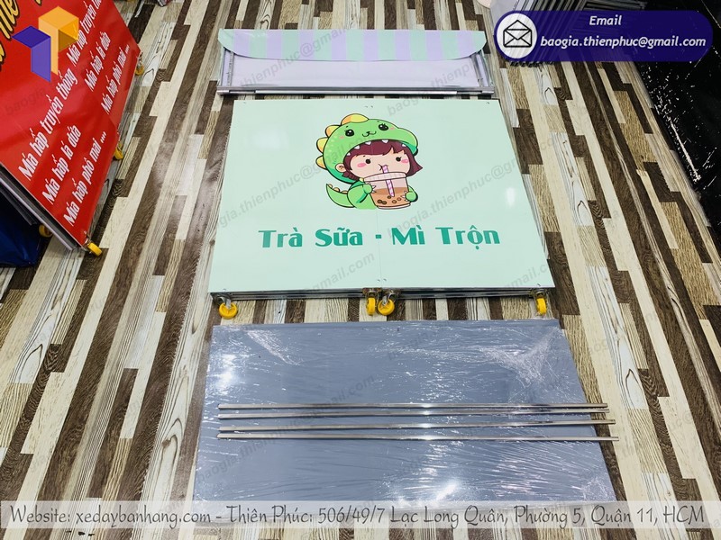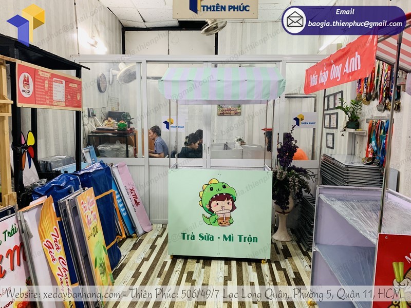 Điểm nhận diện của xe đẩy bán trà sữa Thiên Phúc là có thiết kế nhỏ gọn nhưng tiện dụng trên nền chất liệu thép không gỉ. Và không chỉ chú trọng đến độ bền, xe còn gây ấn tượng bởi phong cách trang trí độc lạ.