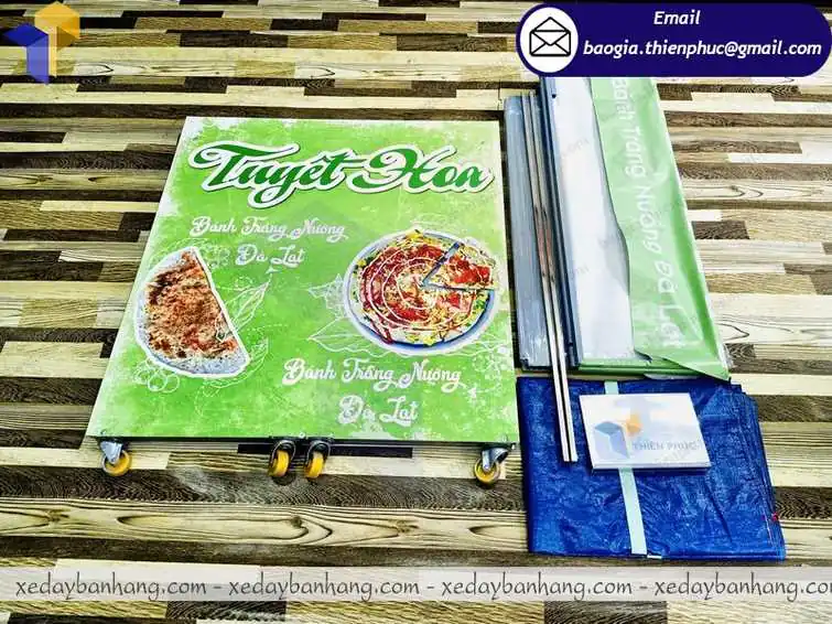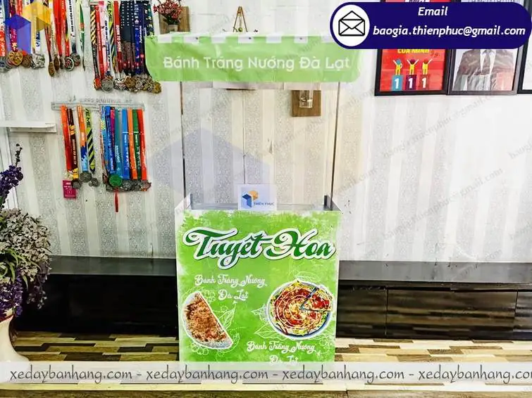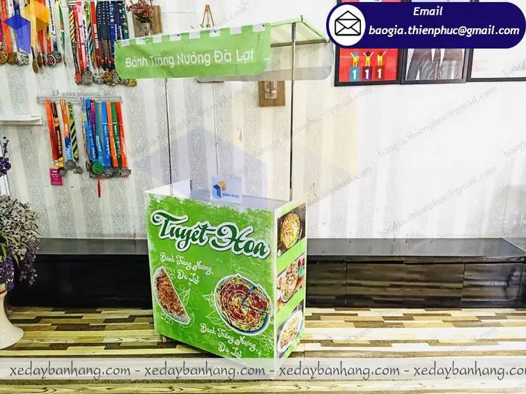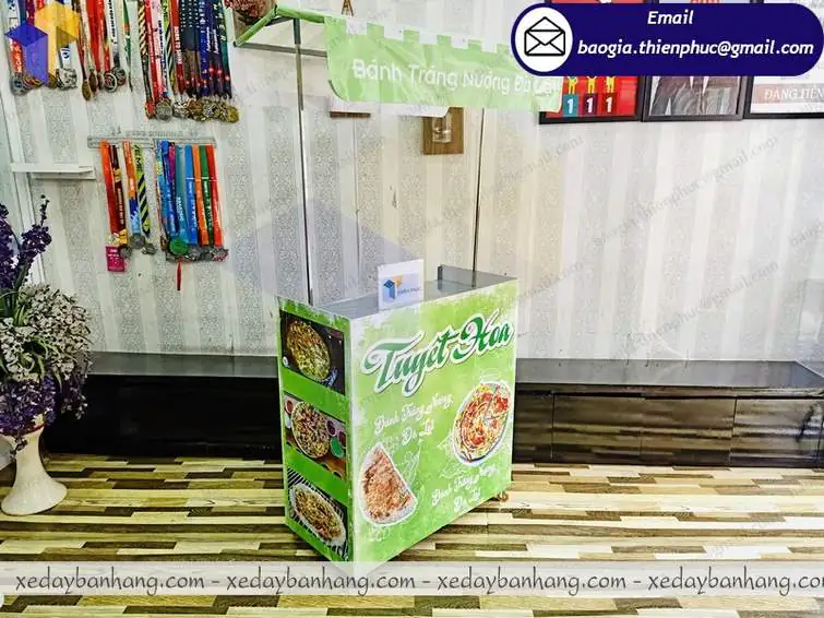 Với phần khung sắt vuông 12mm chắc chắn, ốp thêm fomat bên ngoài, mái che bạt và có bánh xe, bạn hoàn toàn có thể yên tâm, vì booth lắp ráp bán bánh tráng nướng hoàn toàn có những đặc điểm của một chiếc xe đẩy thường.
