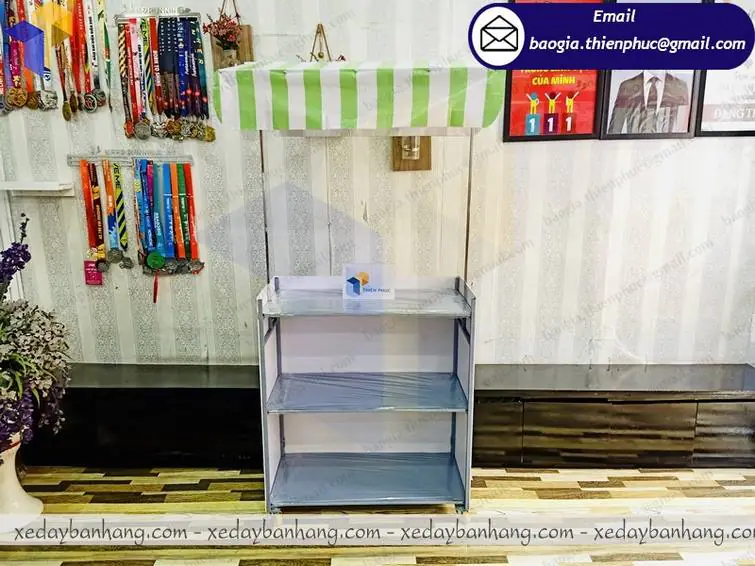+ Tiện dụng hơn khi quầy xe lắp ráp bán hàng di động này có thể đẩy đi bất cứ đâu bạn muốn, có cả mái che bằng bạt che nắng.