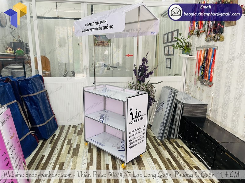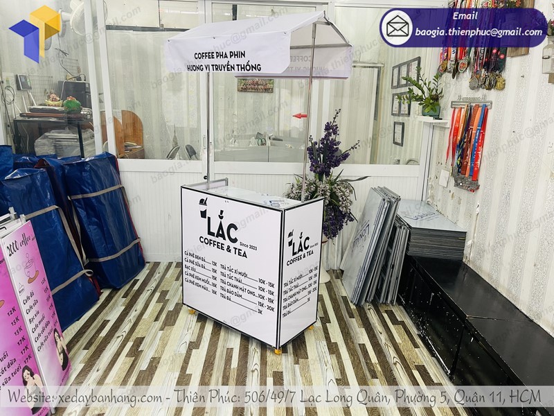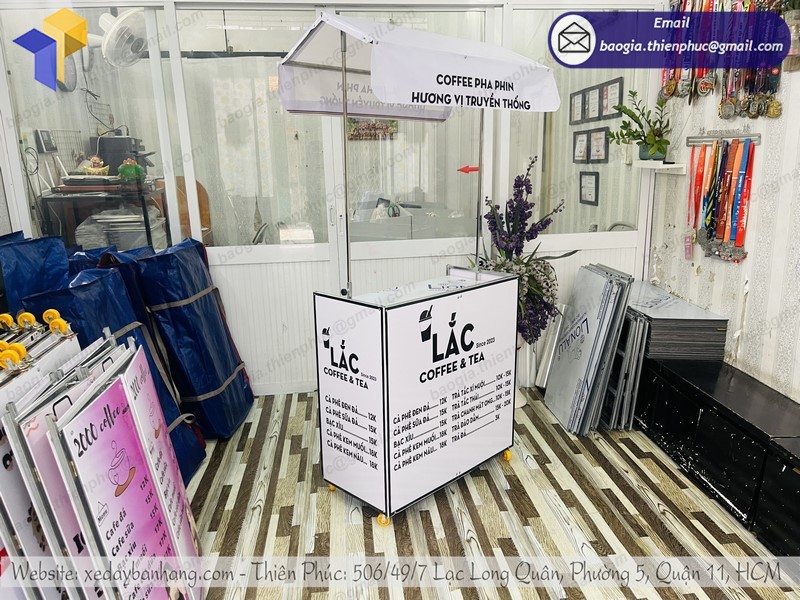 xe café mini lắp ráp được thiết kế nhỏ gọn gồm mái che, bàn pha chế, tủ để đồ, bánh xe,… đầy đủ công năng cho bạn sử dụng.