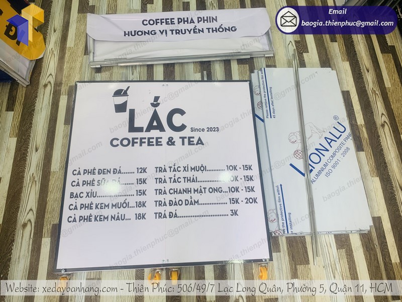 Bảng hiệu trên xe café mini lắp ráp thể hiện những thông tin về quán như tên quán, menu, phương thức thanh toán,… giúp khách hàng dễ lựa chọn, quá trình mua bán trở nên nhanh chóng và thuận tiện hơn.