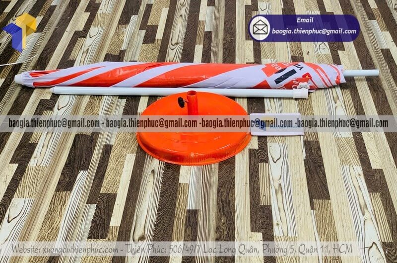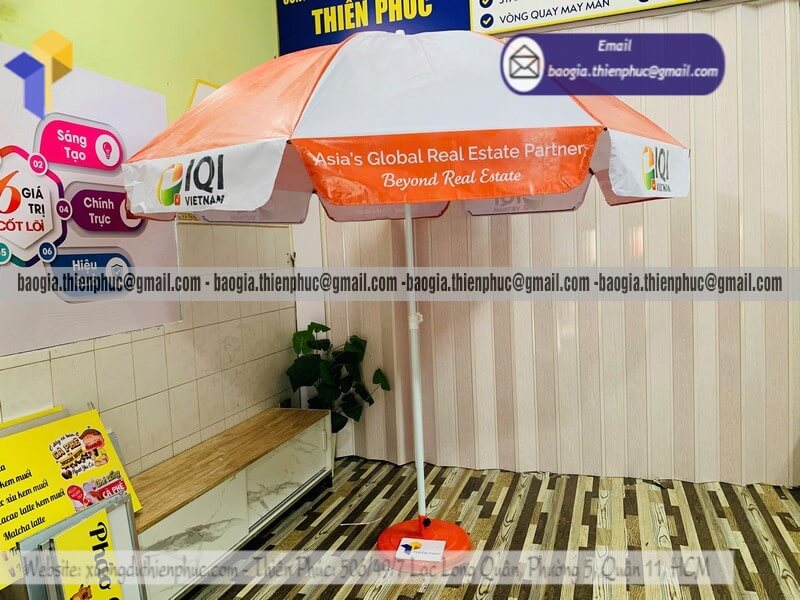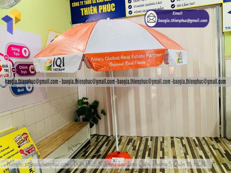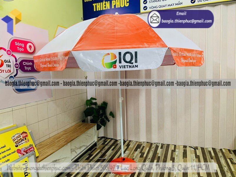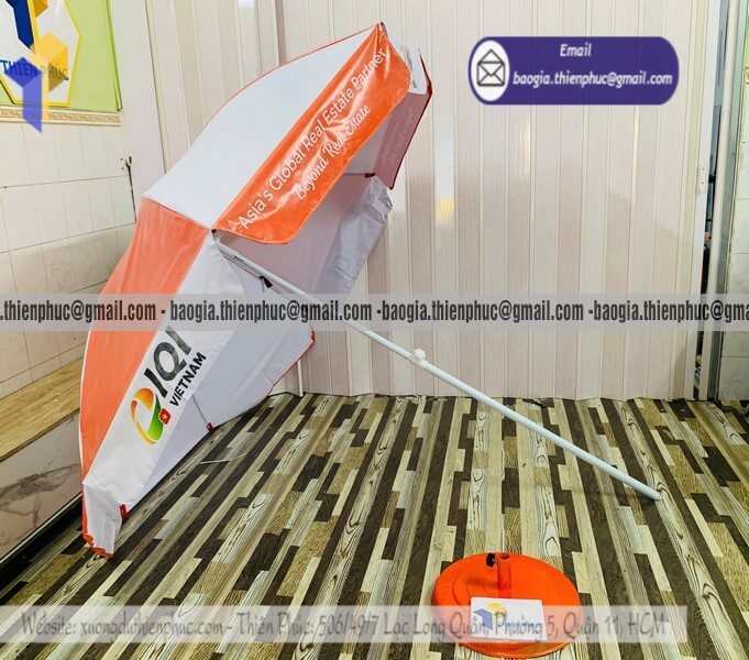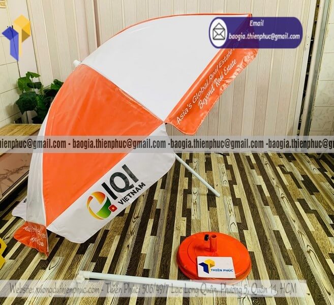 Đặt in dù tròn bạt quảng cáo chịu gió cho sự kiện - Xưởng sản xuất & Công Ty Thiên Phúc chuyên cung cấp nhiều mẫu ô/dù tròn quảng cáo lớn che ngoài trời & thiết kế, in ấn logo thương hiệu với kích thước chủ yếu 2.2m đến 2.4m, 2.7m hoặc lớn hơn 3m. Với giá dao động rẻ nhất, cạnh tranh nhất thị trường chỉ riêng cây ô dù: 600.000đ - 800.000đ/cây; đế dù mua lẻ: 150.000đ/cái. Nếu mua đế cùng cây dù giảm còn 100.000đ/cái. Đặt số lượng lớn nhận ngay nhiều chiết khấu ưu đãi. Hỗ trợ xuất hóa đơn VAT đỏ. Liên hệ ngay xưởng sản xuất Thiên Phúc để nhận ngay báo giá nhanh chóng và tư vấn thiết kế logo. Giao hàng nhanh trên toàn quốc trong vòng 3-5 ngày tùy thuộc vào số lượng.