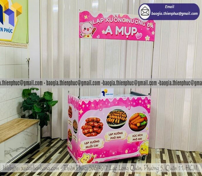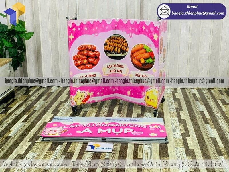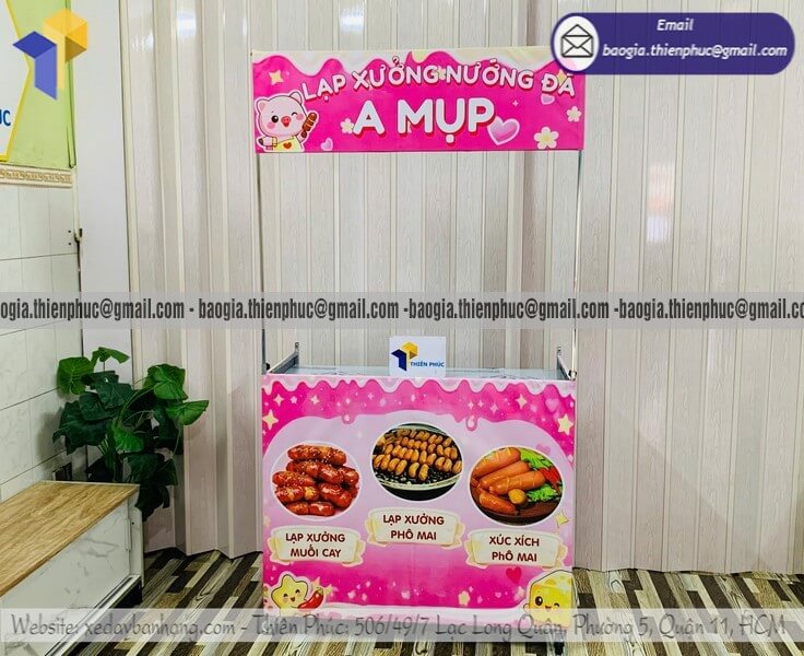Đặt mẫu kệ đẩy bán lạp xưởng nướng gấp xếp lề đường - Xưởng sản xuất & Công Ty Thiên Phúc là xưởng chuyên nhận đặt làm theo yêu cầu, gia công, sản xuất, thiết kế & in ấn logo thương hiệu - nhãn hiệu - menu sản phẩm tủ bán hàng rong lắp ráp lưu động theo yêu cầu khách hàng với hơn 10 năm kinh nghiệm, cung cấp nhiều mẫu kệ/tủ/quầy/xe bán hàng gấp gọn lưu động, chỉ cần 700.000đ/QUẦY trở lên với chất lượng ốp bạt,... chưa kèm theo chi phí khác như menu, đèn led, ô dù, kệ xếp,... Hỗ trợ xuất hóa đơn VAT. Đặt hàng từ 10 QUẦY trở trở lên giảm mỗi kệ 50.000đ. Giao hàng nhanh trên toàn quốc. Thiết kế logo hoàn toàn miễn phí. Mẫu trên giá 4.100.000đ/QUẦY.