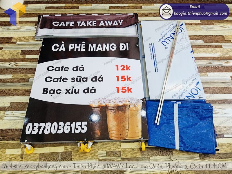 Bên cạnh đó, với đội ngũ gia công giàu kinh nghiệm, Thiên Phúc còn hỗ trợ tư vấn và thiết kế xe lắp ráp bán cà phê theo yêu cầu, mang đậm dấu ấn riêng của chủ xe đẩy với mức giá cạnh tranh nhất thị trường hiện nay. Bạn chỉ cần bỏ ra từ 1 triệu đồng là đã có thể sở hữu ngay một chiếc tủ bán cà phê chất lượng với thiết kế độc đáo từ Thiên Phúc.