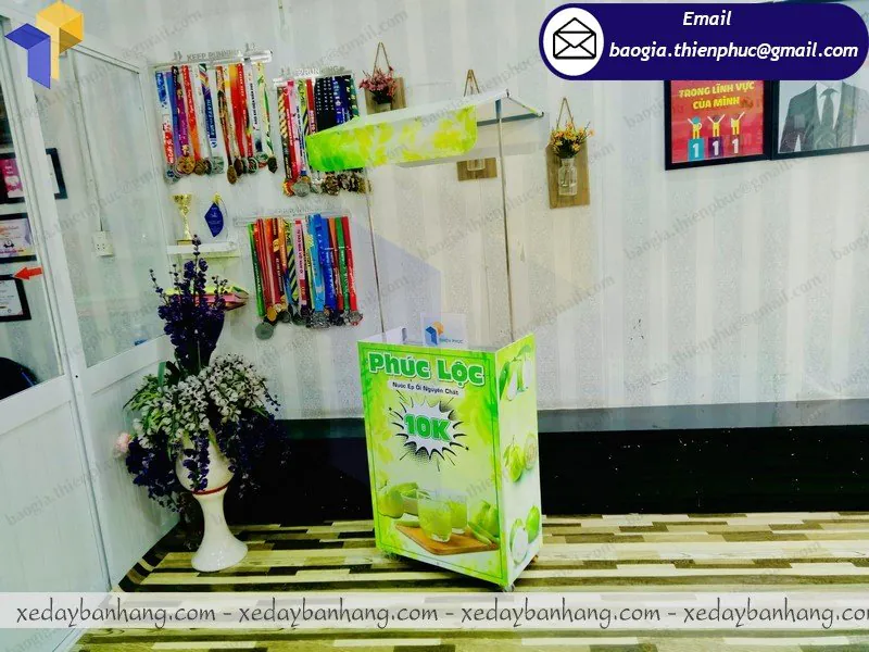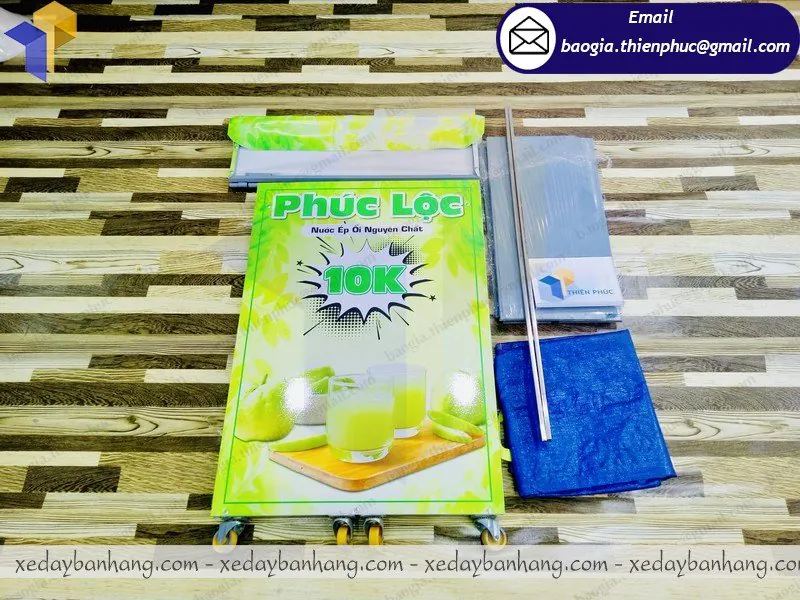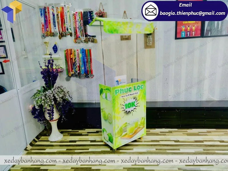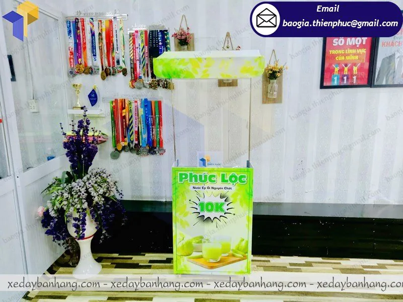 Và để mình bật mí 1 xưởng chuyên cung cấp xe lắp ráp bán nước ép ổi với nhiều mẫu mã đa dạng, hấp dẫn, giá thành rẻ lại còn được thiết kế theo yêu cầu, đó chính là xưởng xe Thiên Phúc – xưởng chuyên cung ứng các vật phẩm quảng cáo giá rẻ với sản phẩm chủ lực đó chính là xe bán hàng – xe bán nước ép lưu động giá rẻ