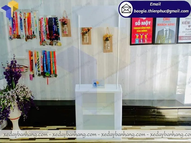 + Hai cây chống nối với logo và phần quầy bằng thép ống sơn trắng