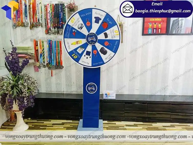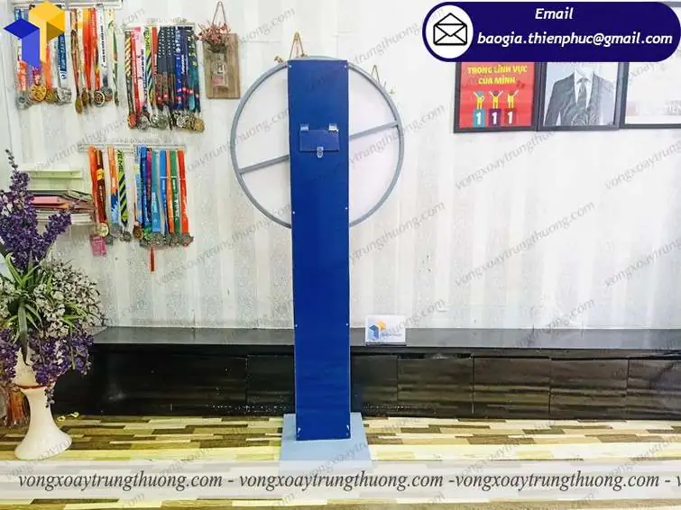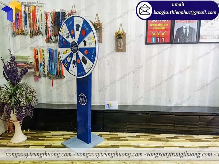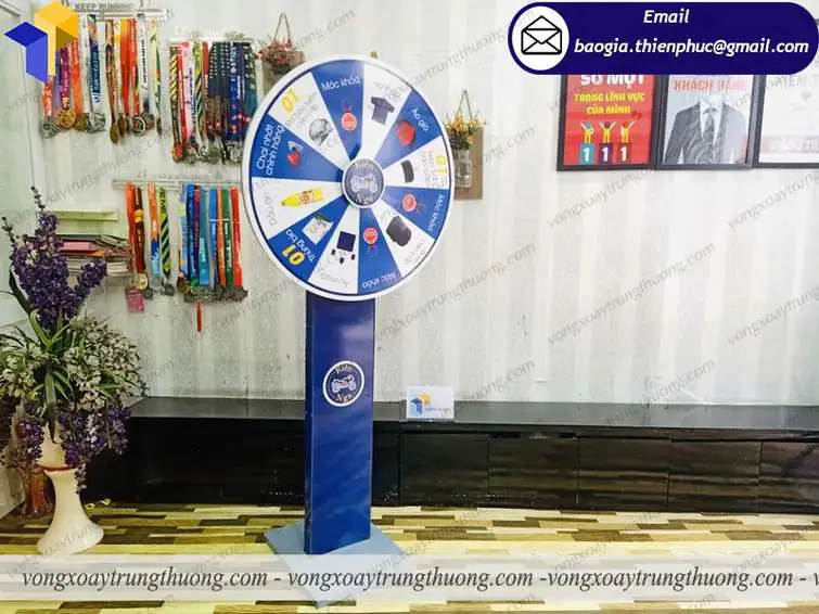 Đặc điểm của Vòng quay chân trụ trúng quà tặng có thiết kế phần đế dạng thân trụ, tạo độ chắc chắn cao cho sản phẩm, mang lại độ bền giúp vòng quay có tuổi thọ rất cao. Ngoài ra chúng tôi sơn tĩnh điện trên toàn bộ sản phẩm để sản phẩm vòng quay thêm bắt mắt và an toàn khi sử dụng suốt quá trình sử dụng hơn. Mâm xoay là bộ phận mấu chốt của chiếc vòng quay, được lên ý tưởng rất chi tiết thông qua tham khảo của khách hàng. Với bán kính 80cm chiếc vòng xoay thể hiện rất rõ nội dung chi tiết mà khách hàng muốn gửi gắm.