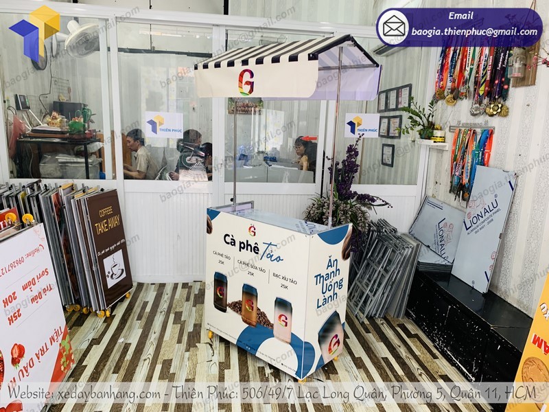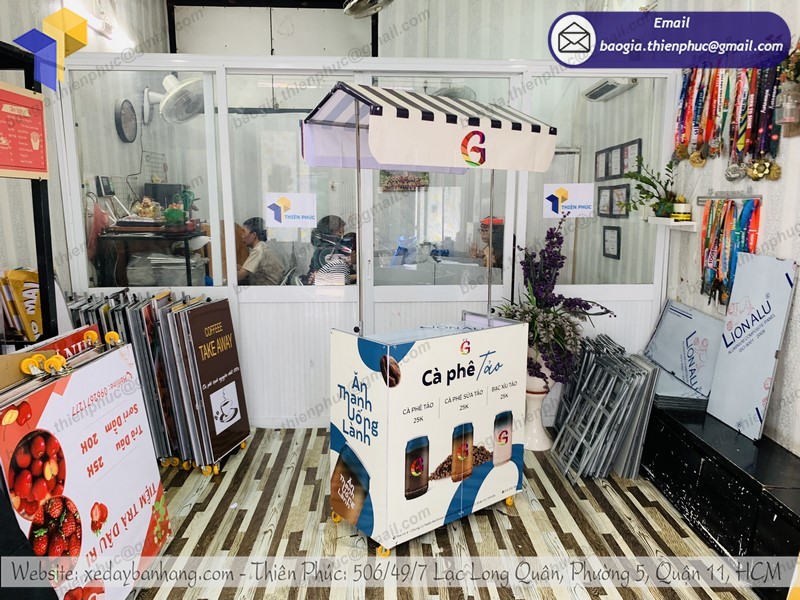 Một trong những địa chỉ bạn có thể hoàn toàn yên tâm khi mua sắm xe đẩy bán cafe đó chính là Thiên Phúc. Tại Thiên Phúc cung cấp xe bán cafe, trà sữa,.. di động bằng chất liệu inox 304 cao cấp với đề can nổi bật, đẹp mắt để thu hút khách hàng ghé quầy.