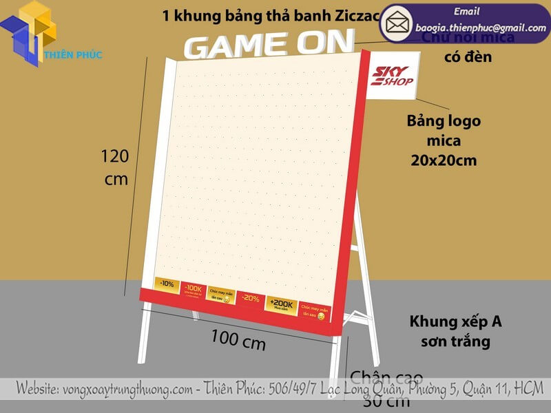 Gia công khung thả rơi bóng ziczac trúng quà minigame - Xưởng sản xuất Thiên Phúc nhận gia công và sản xuất mẫu khung ziczac cho sự kiện với giá rẻ nhất chỉ từ 750.000đ/cái đối với loại nhỏ mini kích thước 35x50cm và trên 4.000.000đ cho kích thước lớn hơn có đèn nổi mica kèm theo. Nhận làm kích thước và mẫu mã theo yêu cầu. Thiết kế logo hoàn toàn miễn phí. Liên hệ Thiên Phúc để báo giá chi tiết hơn.