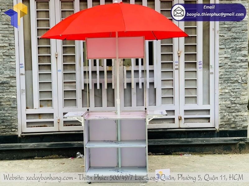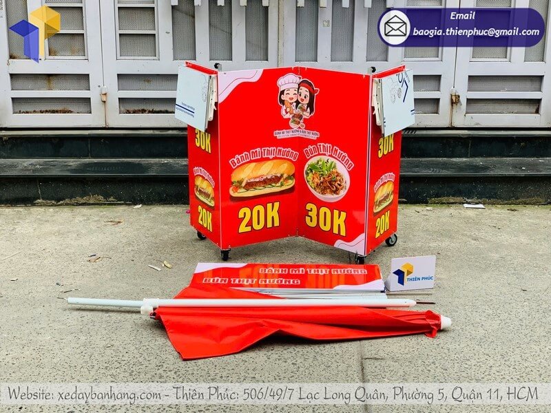 Gia công tủ bán bánh mì xếp gọn có dù che ngoài trời - Thiên Phúc là xưởng sản xuất&công ty với hơn 10 năm kinh nghiệm trong gia công - sản xuất và cung cấp tủ bán hàng di động xếp gọn kèm theo dù che với giá rẻ nhất chỉ từ 700.000đ/tủ trở lên chưa kèm dù và 150.000đ - 400.000đ/cây dù. Hỗ trợ thiết kế logo miễn phí theo nhãn hiệu thương hiệu hoặc menu. Hỗ trợ xuất hóa đơn VAT nhanh chóng. Đặt từ số lượng 10 tủ trở lên được giảm chiết khấu ưu đãi. Nhanh tay đặt hàng tại Thiên Phúc, giao nhanh trong ngày.