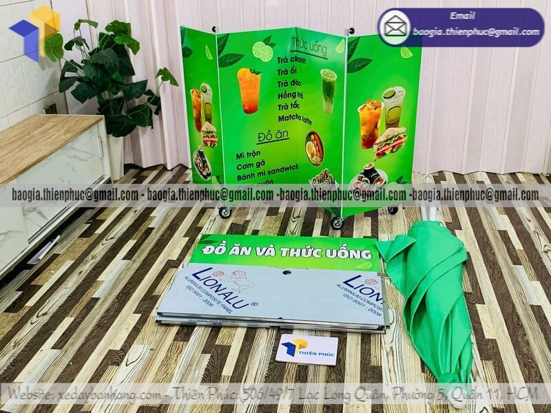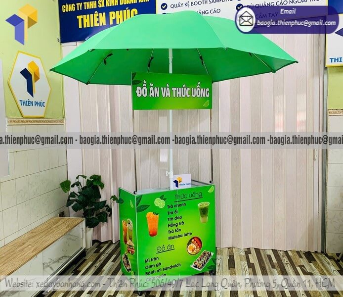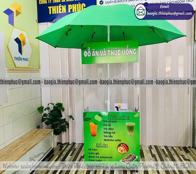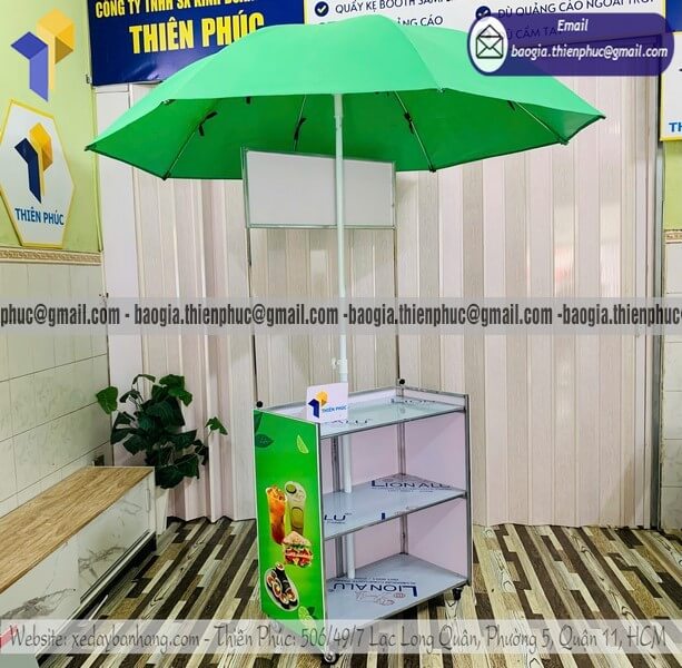 Giá kệ bán thức uống trên hè phố lắp ráp gắn dù che - Tại xưởng sản xuất & Công Ty Thiên Phúc là nơi gia công và cung cấp mẫu kệ bán hàng gấp gọn di động/lưu động có kèm thêm dù che, giá rẻ nhất dao động từ 700.000đ/kệ đến trên 2.200.000đ/kệ trở lên đối với loại tủ ốp bạt + Dù che : 100.000đ/cây - 400.000đ/cây. Chưa kèm chi phí đi kèm khác như thêm bệ xếp, thích hợp thêm menu hoặc vòng xoay trúng thưởng. Đặt từ 10 kệ trở lên, được chiết khấu nhiều ưu đãi. Duyệt thiết kế demo hôm nay, qua hôm sau là có hàng ngay. Hãy liên hệ ngay xưởng Thiên Phúc để nhận ngay báo giá nhanh chóng hoặc đến trực tiếp ngay tại xưởng để được tư vấn mẫu mã kích thước và thiết kế. Cọc 50% đơn hàng trước khi đặt hàng. Tặng kèm 1 hashtag cầm tay
