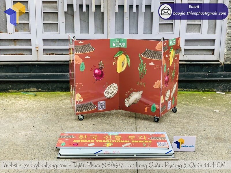 Tên sản phẩm: Giá mẫu quầy bán đồ ăn dạo xếp gọn trên vỉa hè với logo bán rau rủ HÀN QUỐC