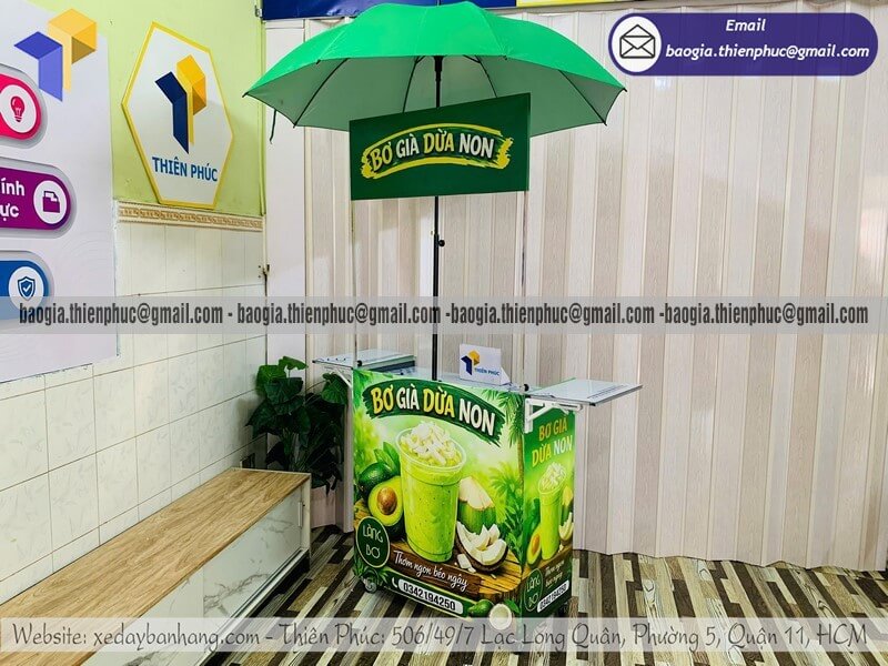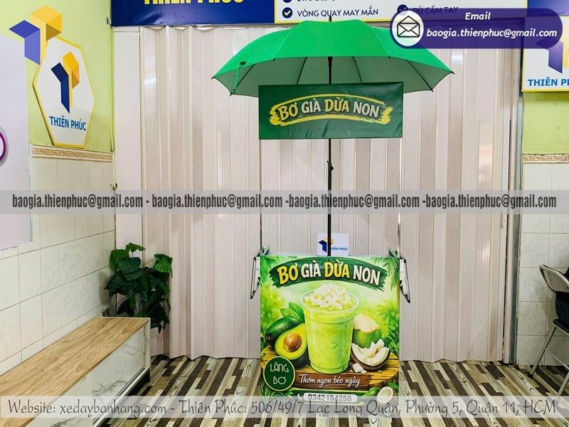 Giá tủ bán nước nhỏ xếp gọn di động có dù che giá rẻ - Tại xưởng sản xuất & Công Ty Thiên Phúc là nơi gia công và cung cấp mẫu tủ bán hàng gấp gọn di động/lưu động có kèm thêm dù che, giá rẻ nhất dao động từ 700.000đ/tủ đến trên 2.200.000đ/tủ trở lên đối với loại tủ ốp bạt + Dù che : 100.000đ/cây - 400.000đ/cây. Chưa kèm chi phí đi kèm khác như thêm bệ xếp, thích hợp thêm menu hoặc vòng xoay trúng thưởng. Đặt từ 10 tủ trở lên, được chiết khấu nhiều ưu đãi. Duyệt thiết kế demo hôm nay, qua hôm sau là có hàng ngay. Hãy liên hệ ngay xưởng Thiên Phúc để nhận ngay báo giá nhanh chóng hoặc đến trực tiếp ngay tại xưởng để được tư vấn mẫu mã kích thước và thiết kế. Cọc 50% đơn hàng trước khi đặt hàng.