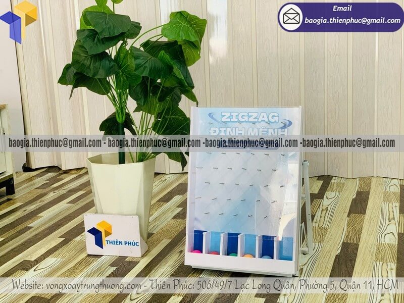 Hộp trò chơi thả bóng zigzag để bàn rơi trúng ô quà là một dạng minigame tương tác được thiết kế dưới dạng hộp đứng, bên trong có hệ thống đường đi zigzag giúp quả bóng rơi ngẫu nhiên xuống các ô quà thưởng bên dưới.
