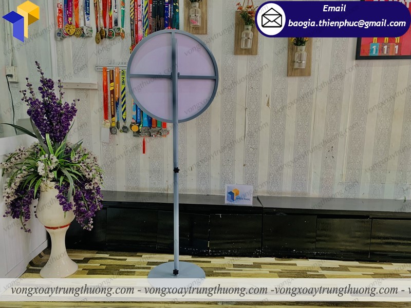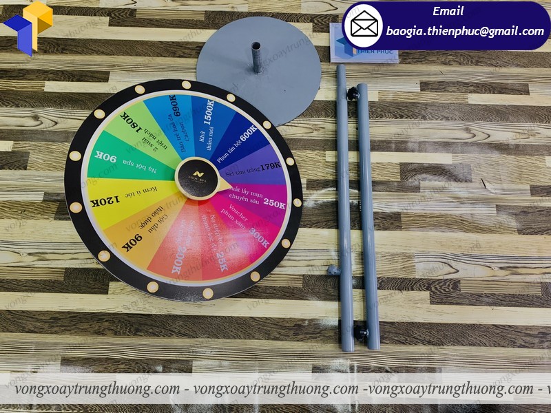 Chân của vòng quay may mắn giá rẻ, vòng quay trúng thưởng được làm bằng sắt có kích tước tùy theo nhu cầu khách hàng. Bộ phận chân được gia công khá kỹ lưỡng và chắc chắn vì nó trụ toàn bộ vòng quay này, thông thường khi hoàn thiện thì chúng tôi sơn một lớp sơn bên ngoài vừa tạo tính thẩm mỹ và không bị bào mòn theo thời gian.