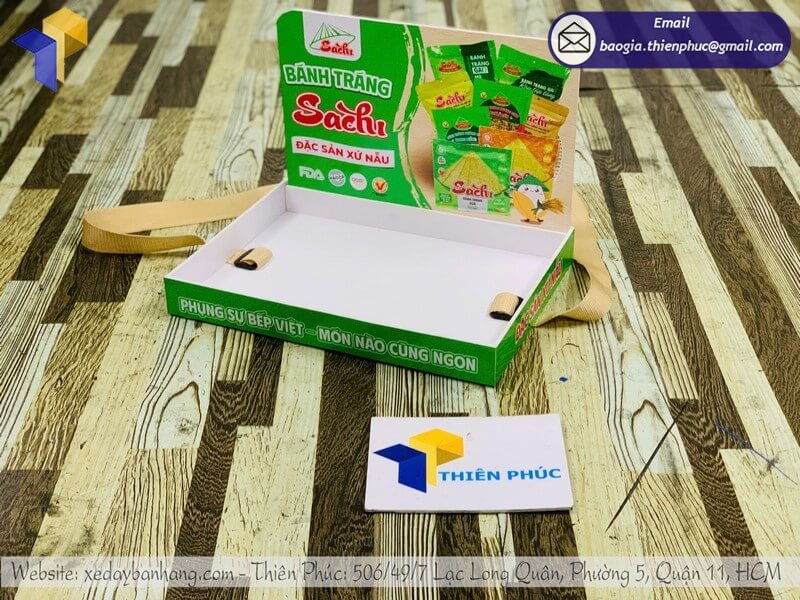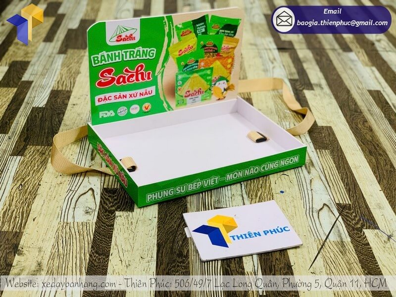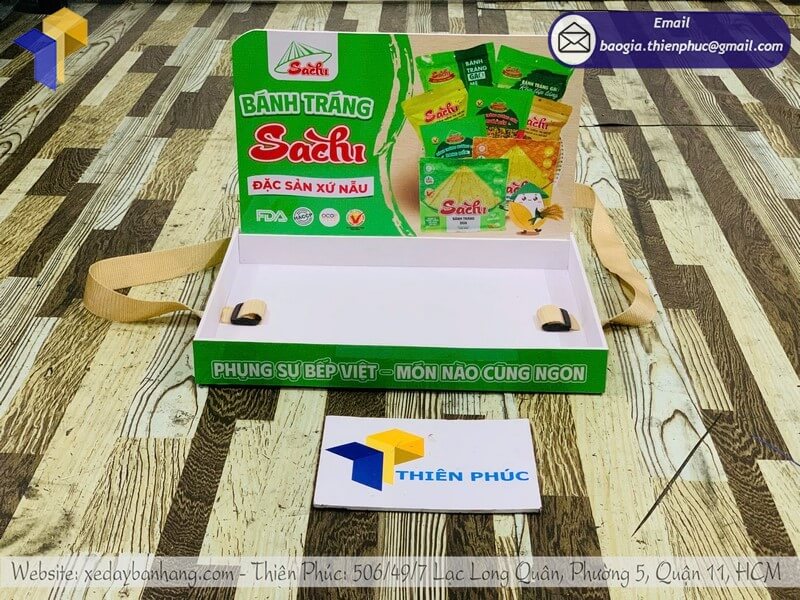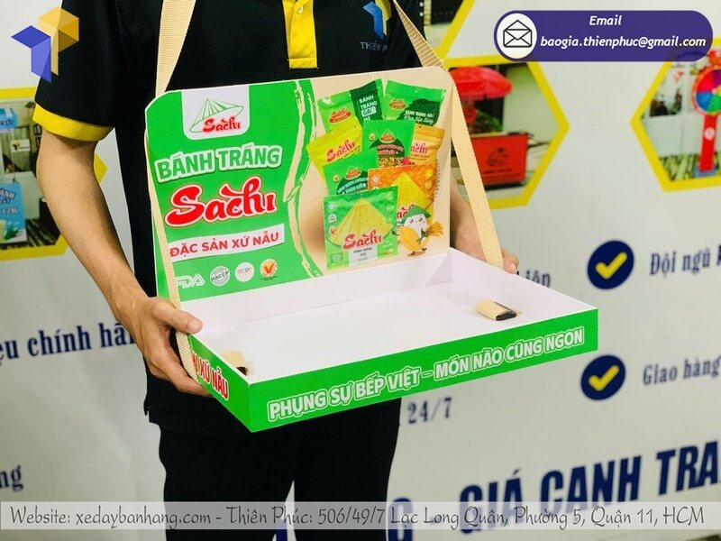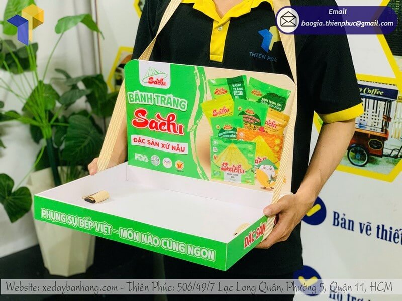 - Trả lời: Khay được thiết kế gọn nhẹ, dễ đeo, phù hợp với mọi loại sự kiện từ hội chợ, triển lãm đến phát mẫu thử tại siêu thị.
