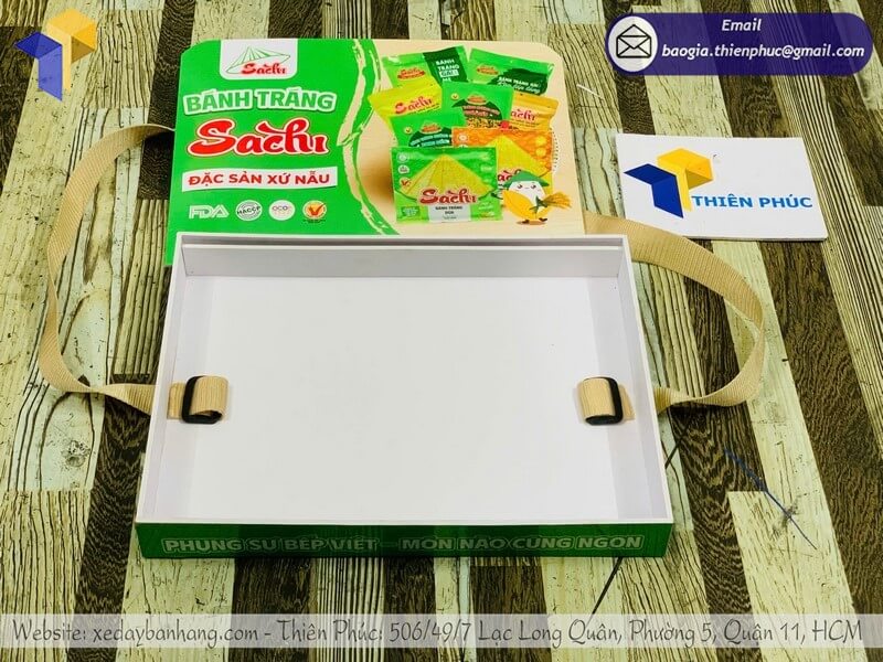 Tên sản phẩm: Khay đeo sampling nhựa giá rẻ in logo nhãn hiệu BÁNH TRÁNG SACHI ĐẶC SẢN XỨ NẪU