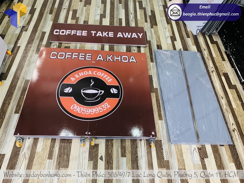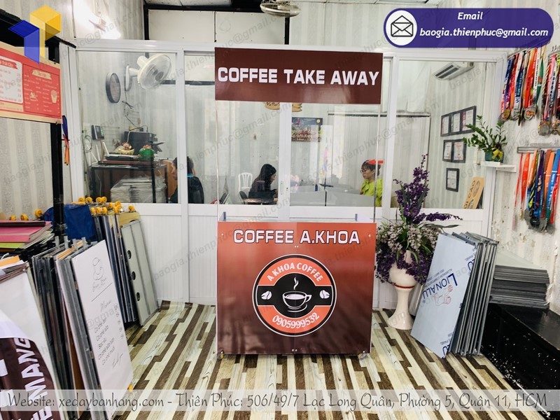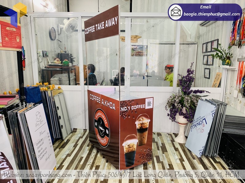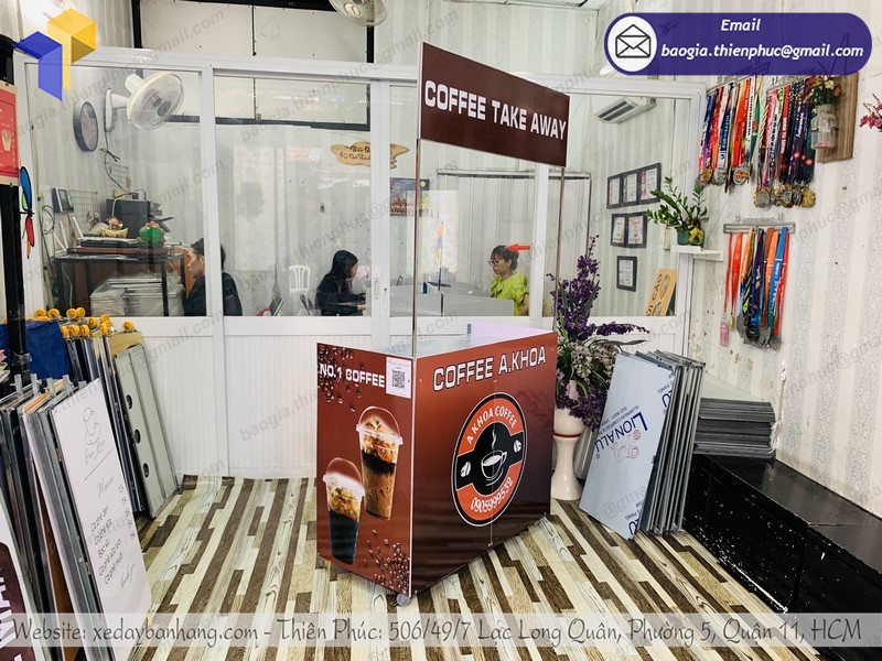 xe xếp gọn bán cà phê tại Thiên Phúc chúng tôi thường có thiết kế rất đẹp mắt, được in ấn sản phẩm, tên của các thương hiệu trực tiếp lên quầy giúp cho quý khách hàng dễ dàng nhận diện được thương hiệu từ xa. Được sản xuất bằng chất liệu nhựa dẻo đạt 100% không pha có thể tháo lắp dễ dàng và trưng bày tại các siêu thị hoặc các gian hàng hội chợ triển lãm hay bán hàng vỉa hè, bắt mắt mà tiết kiệm khá nhiều chi phí