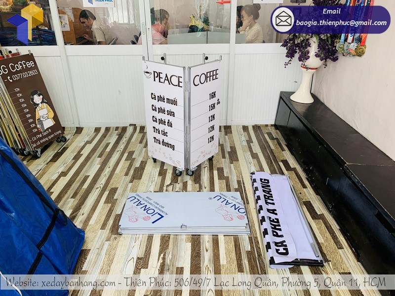 Decal xe bán cà phê được thiết kế đặc biệt ở mặt trước và hai bên hông thân tủ, thu hút khách hàng tại “3 chiều hướng” khác nhau, dù nhìn tủ trên góc độ nào cũng đều bị thu hút. Thêm nữa, trên decal có đầy đủ thông tin cửa hàng, sdt, menu và giá bán… giúp người mua dễ dàng chọn lựa.