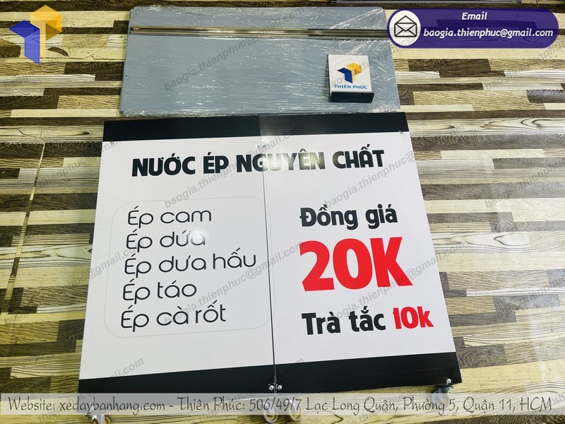 - Phần hình ảnh xe lắp ráp bán nước ép trái cây được gia công từ chất liệu decal cán format 5mm. Chất liệu decal cán bóng hoặc cán mờ theo yêu cầu. Vì chất liệu decal chuyên được sử dụng ngoài trời nên không lo nắng mưa hay bong tróc. Đảm bảo độ bền màu, sáng bóng và sắc nét về mặt hình ảnh. Chất liệu format chuyên dụng dùng trong quảng cáo sẽ giúp quầy thêm thẩm mỹ.