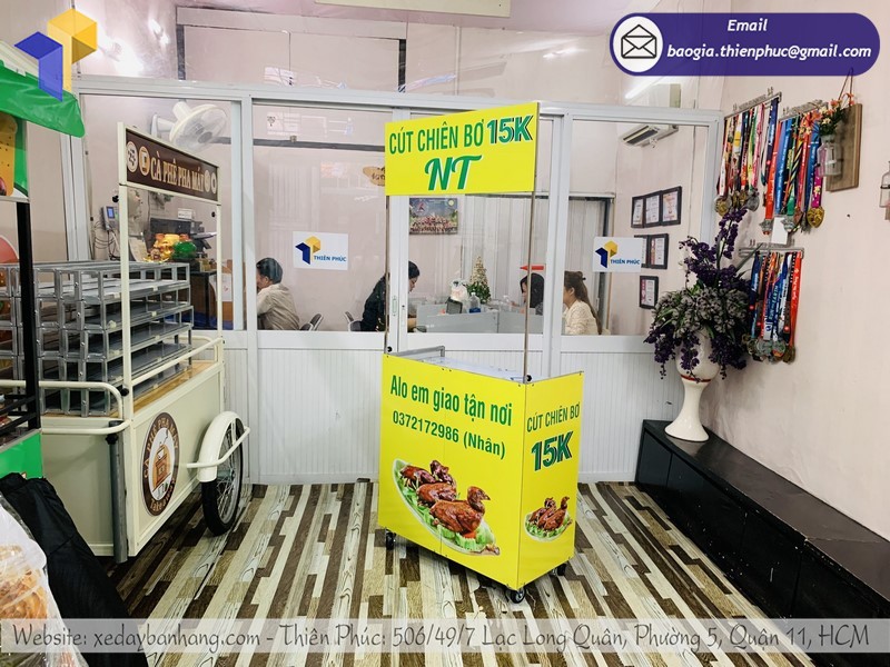 - Mặt kính xe lắp ráp bán cút chiên bơ được lắp đặt bao ngoài để giúp bạn đảm bảo an toàn hơn trong vấn đề vệ sinh thực phẩm và tăng tính thẩm mỹ cho xe bán hàng. Vì đồ uống và hoa quả được đặt trong mặt kính nên sẽ đảm bảo vấn đề an toàn vệ sinh thực phẩm, bụi bẩn cũng không bám vào.