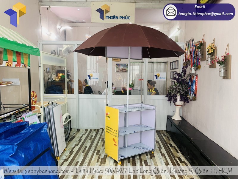 Quầy bán di động gồm 1 thùng để bạn chứa cốc, bàn ghế nhựa nhỏ,… bên trên quầy có mái che bảo vệ các nguyên liệu chế biến, che nắng mưa cho người bán hàng và khách hàng khi đứng mua. Với thiết kế gọn nhẹ và có bánh xe di động có chốt khóa an toàn nên bạn có thể di chuyển đến bất cứ đâu bạn mong muốn.