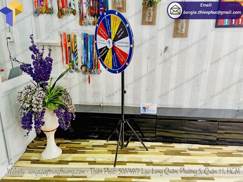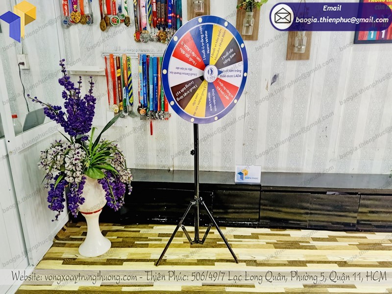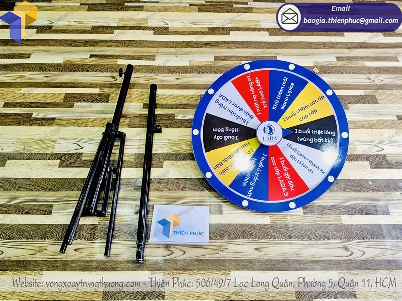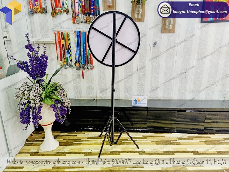 Vòng quay may mắn với giá rẻ, vòng quay trúng thưởng chân xếp thường được làm bằng decal hoặc bằng sắt bao gồm một chân trụ và một vòng tròn. Kích thước của vòng quay may mắn thường bao gồm phần biển và phần đế
