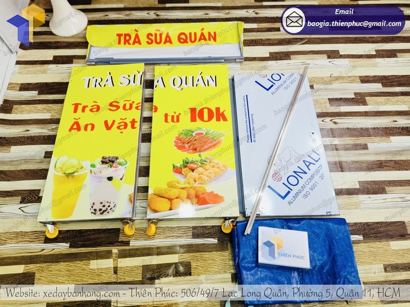 Phần logo quảng bá cho hình ảnh: Không sử dụng mẫu truyền thống. Được thiết kế độc đáo theo với những hình mẫu mới, phần thiết kế to hơn và nổi bật hơn rất nhiều. Vẫn là những hình ảnh in decal ngoài trời nhưng được cán format 5 ly được cắt bế định hình theo decal. Sau đó, những mẫu hình die cut này được chọn và ốp trực tiếp lên tấm logo truyền thống. Phần hình ảnh này làm cho xe xếp gọn bán trà sữa take away tiện lợi trở nên đẹp hơn và thu hút hơn.