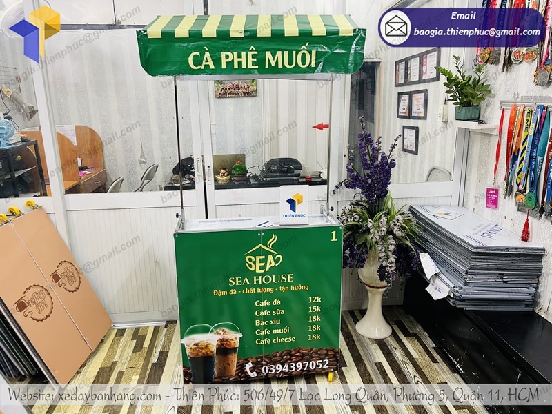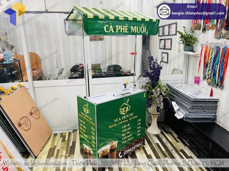Với đội ngũ chuyên gia nhiều năm kinh nghiệm trong ngành, Thiên Phúc tự hào là thương hiệu uy tín, dẫn đầu trong sản xuất các loại xe đẩy bán hàng lưu động. Trong các dòng xe đẩy được ưa chuộng chọn mua tại Thiên Phúc có quầy gấp gọn bán cà phê. Bởi các mẫu xe luôn được cập nhật cải tiến liên tục để bắt kịp xu hướng. Người bán có thể yên tâm mua hàng tại đây. Sản phẩm không những bền, đẹp mà giá cả còn cạnh tranh.