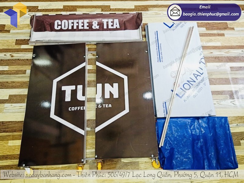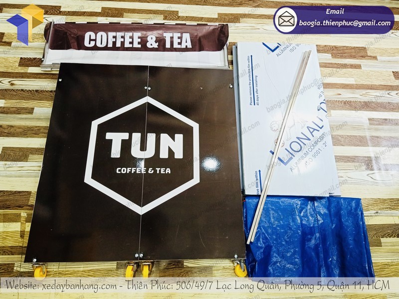 Bảng hiểu trên xe bán cà phê gấp gọn thể hiện những thông tin về quán như tên quán, menu, phương thức thanh toán,… giúp khách hàng dễ lựa chọn, quá trình mua bán trở nên nhanh chóng và thuận tiện hơn.