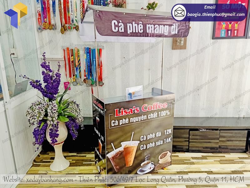 Không cần thuê mặt bằng, không cần đầu tư nội thất, bạn vẫn có thể tạo ấn tượng với khách hàng bằng xe xe bán café vỉa hè nhỏ gọn. Bạn có thể trang trí mô hình xe cafe take away thêm decal, hộp đèn và dây đèn led bắt mắt. Với những thông tin, màu sắc mang phong cách riêng của bạn, khách hàng sẽ dễ dàng nhận ra và tìm đến bạn cho những lần sau.