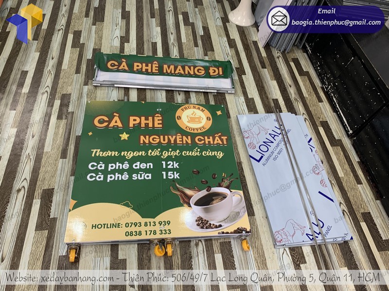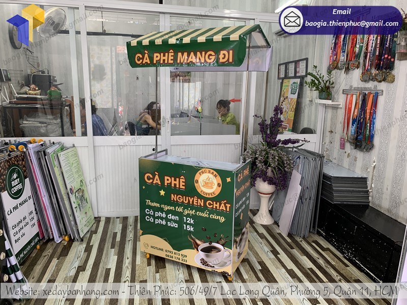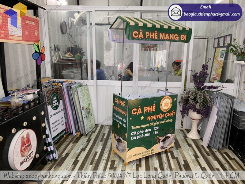 xe bán cà phê gấp gọn tại Thiên Phúc chúng tôi thường có thiết kế rất đẹp mắt, được in ấn sản phẩm, tên của các thương hiệu trực tiếp lên quầy giúp cho quý khách hàng dễ dàng nhận diện được thương hiệu từ xa. Được sản xuất bằng chất liệu nhựa dẻo đạt 100% không pha có thể tháo lắp dễ dàng và trưng bày tại các siêu thị hoặc các gian hàng hội chợ triển lãm hay bán hàng vỉa hè, bắt mắt mà tiết kiệm khá nhiều chi phí.